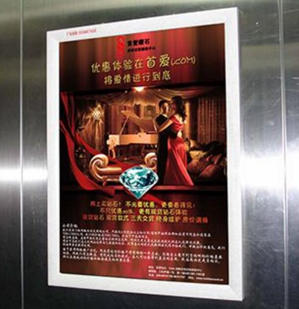 廣州電梯框架廣告是電梯廣告中最常見的廣告形式,廣告形式為靜態海報廣告,鏡框尺寸為450*600mm,畫面尺寸為420*570mm,一般投放在電梯轎廂內和電梯等候廳內兩個位置。