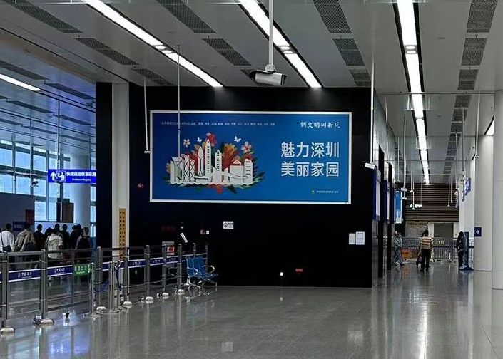 覆蓋深圳前往香港、國外的出境旅客,跨境學童等候區。私家車、出租車落客區,去衛生間必經,與旅客距離近,有視覺沖擊。