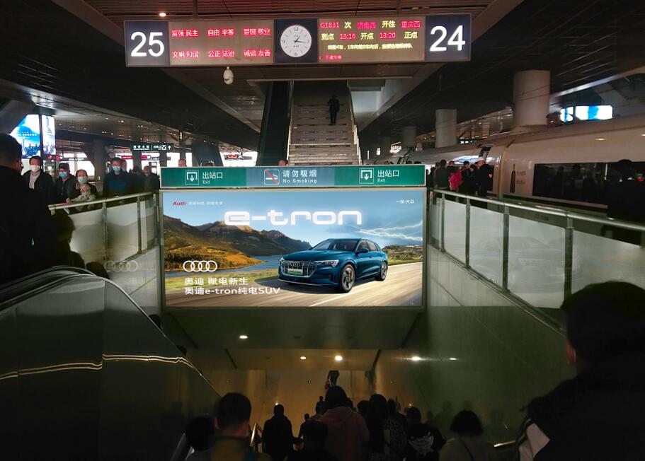 | 西安北站廣告 到達層 出站通道墻面燈箱 · 44塊 媒體尺寸(寬x高x面): 21.6㎡ ( 9m ×2.4m × 1面) 19.44㎡ ( 8.1m ×2.4 m × 1面) 投放形式:4塊/組;1塊/組 媒體價值: 1、媒體位于西安北站到達層出站廳內,媒體面積大,畫面優質,視覺沖擊力強,彰顯企業實力與形象; 2、旅客出站的必經之路,客流量較大,媒體覆蓋面廣。多塊聯排,近距離經過該媒體,更能影響旅客注意力,強制性強。 |
