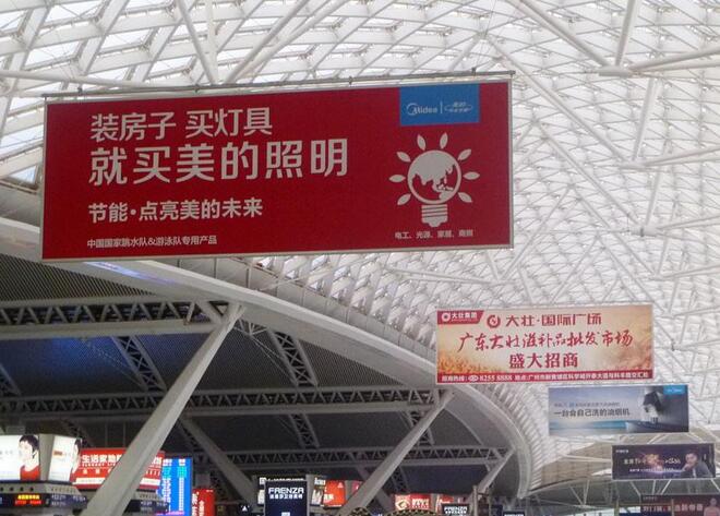 2、高鐵站吊旗看板廣告:主要分布于候車大廳,少部分城市還分布在出站通道處。