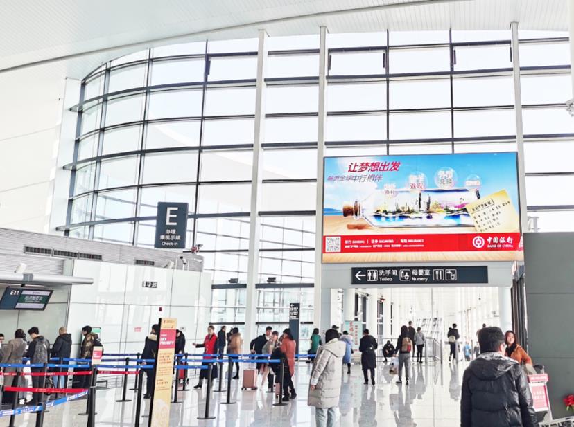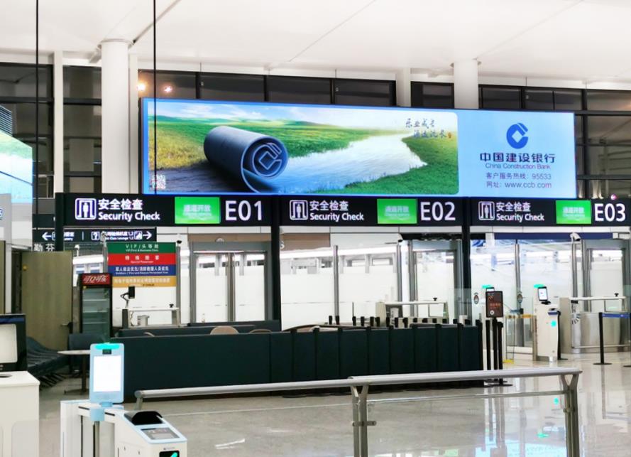 T2國內(nèi)出發(fā)安檢通道右側(cè)墻體上方led大屏廣告