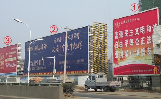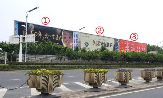 | 合肥落地看板廣告 媒體位置:長(zhǎng)江西路與長(zhǎng)寧大道交口東300米落地廣告牌 發(fā)布形式:噴繪畫面 媒體規(guī)格: 2號(hào):14.5m×7m=102㎡ 3號(hào):26.6m×7m=186㎡ 媒體簡(jiǎn)介:該處是往來(lái)合肥新橋國(guó)際機(jī)場(chǎng)、六安方向、及上下合肥蜀山高速收費(fèi)站必經(jīng)之地,周邊新老地產(chǎn)項(xiàng)目眾多,牌面不僅覆蓋長(zhǎng)江西路往來(lái)車流,亦可覆蓋合肥西繞城高速上車輛視線,牌面緊鄰馬路,可視效果佳。 |