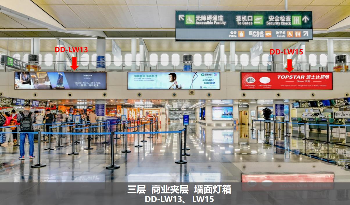 媒體位于航站樓國內出發廳值機島上方; 媒體為雙面吊旗媒體;