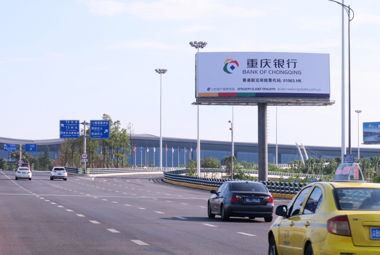T3航站樓進場路第一塊高立柱,地標性媒體 ?主城、渝鄰高速、第一機場大道三條通道匯集。