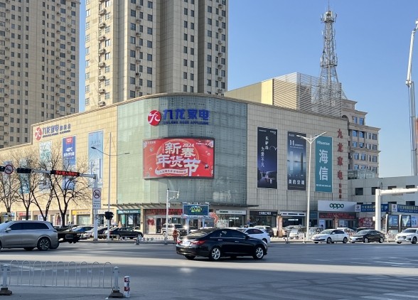大屏位于濟(jì)寧金宇路與琵琶山路交匯處西南角九龍家電商城樓體,處于濟(jì)寧市第二商圈位置,周邊有紅星美凱龍、永旺購物中心、貴和商城、金宇家具等商場(chǎng)。