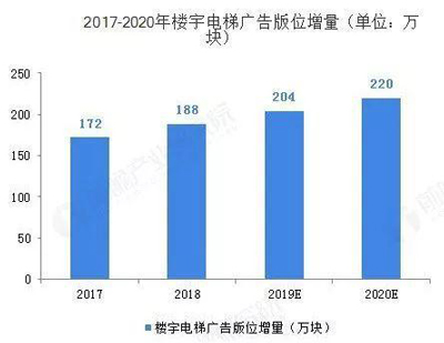 談到電梯廣告,那么就不得不談到中國的電梯行業。近年來我國房地產行業的高層建筑投資比例在增加,加速了電梯的需求量。中國電梯需求從2011年的37萬臺提升至2018年的94萬臺,預計2020年我國 電梯需求量將在110萬臺左右。電梯樓宇框架的增量空間在于國內電梯需求量的增長,一般而言進行廣告投放的電梯每部安置2塊,剔除不適合投放的電梯部數,2017-2020 年樓宇電梯廣告版位的增量分別約為 172、188、204、220 萬塊,每年同比增速在 8-9%之間。