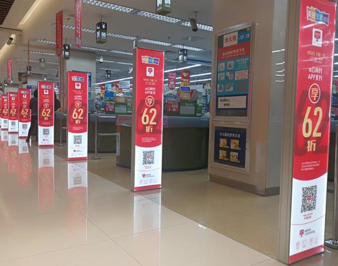 超市入口及收銀區(qū)全面覆蓋,黃金位置,媒體矩陣雙畫(huà)面集中曝光