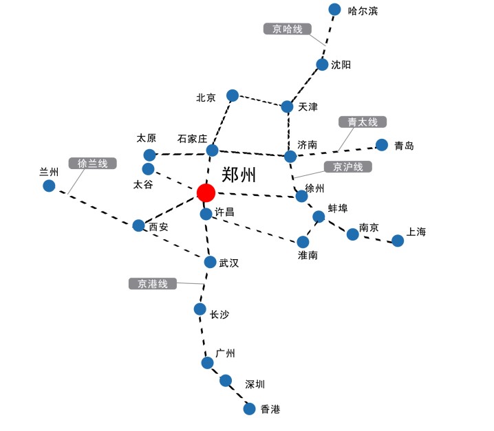 十五條高鐵線路始發:徐蘭線與京港高鐵交匯處,是鄭西高鐵、鄭徐高鐵、鄭渝高鐵等國家高鐵干線及鄭開城際鐵路、鄭焦城際鐵路等中原城市群軌道交通的始發站 輻射國內核心經濟圈:每日開行列車可輻射到環渤海經濟圈、中部經濟圈、珠三角經濟圈、西南/北經濟圈。