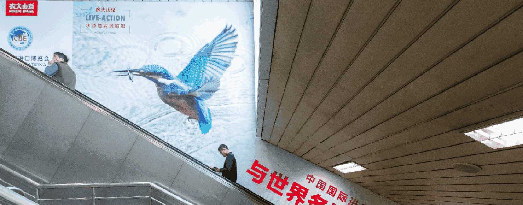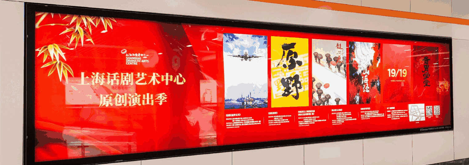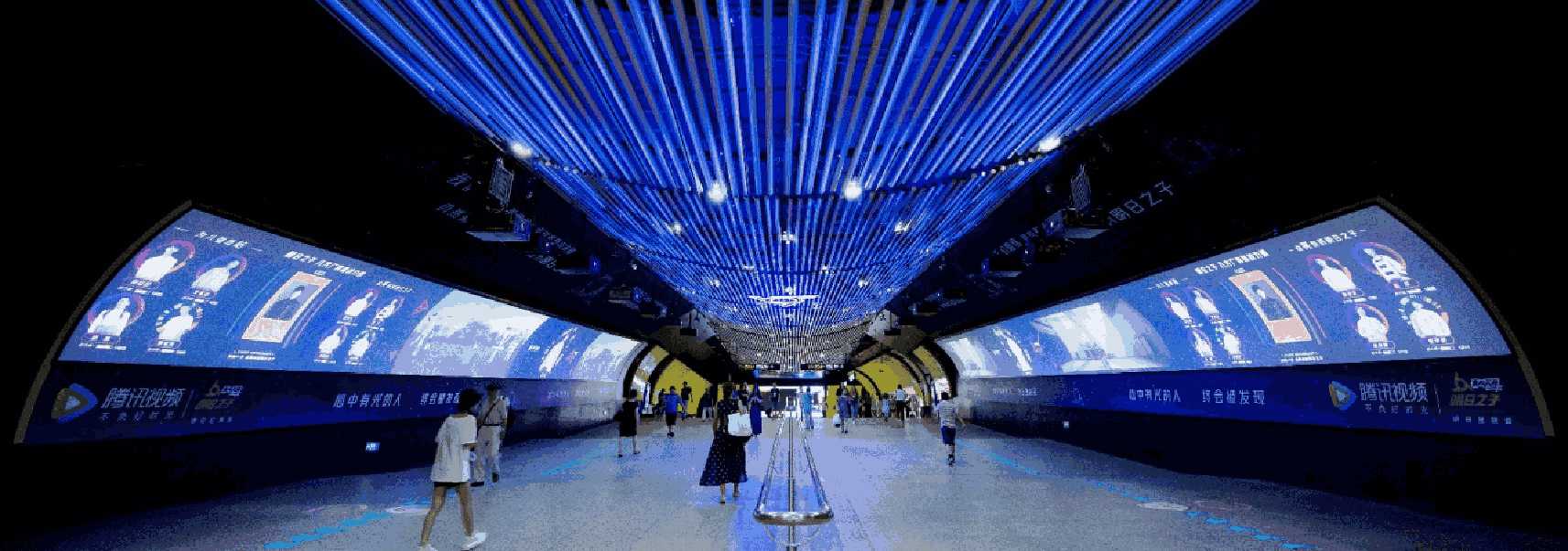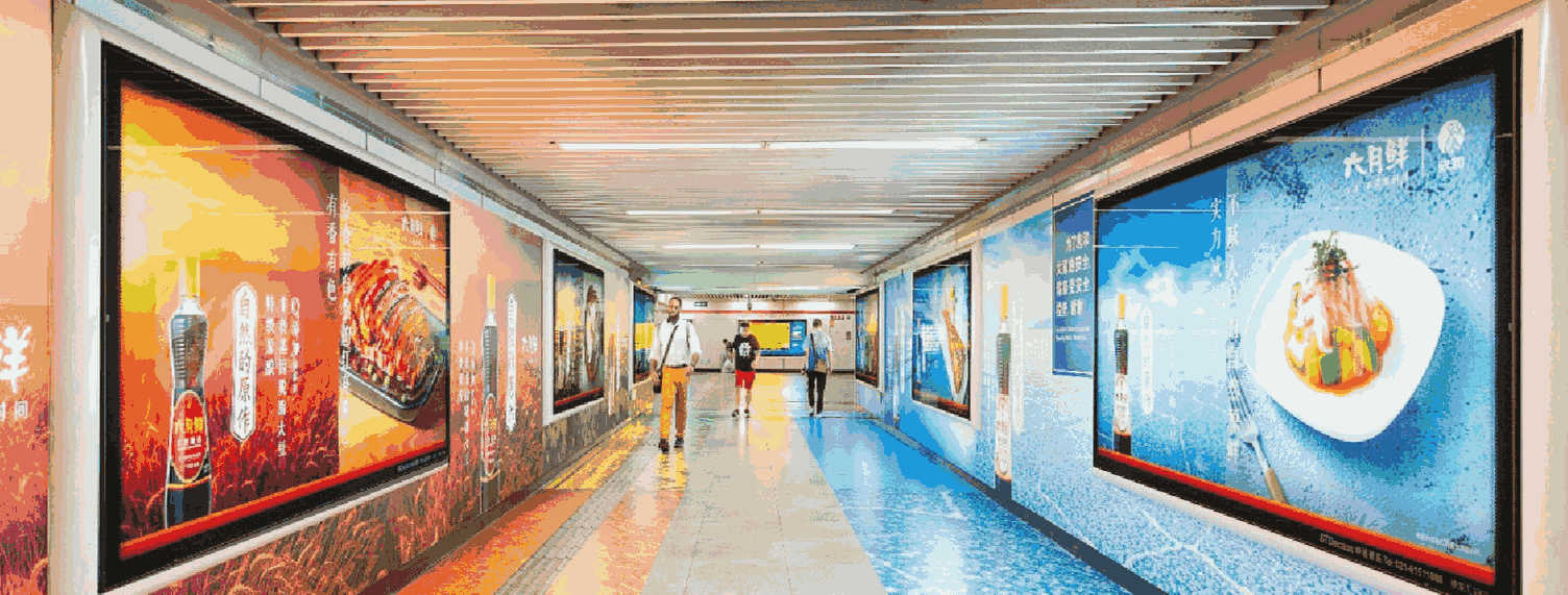 由 電子屏 與 超級動感燈箱,相互交錯組成的電子媒體通道,大面積的靜態海報與高精度的動態畫面不斷沖擊乘客視覺;頂部天花板與通道內柱體的鏡面環境設計從空間上帶來沉浸式的3D體驗;每個區域的定向音響環繞聲系統 從聽覺上刺激乘客的感官體驗 ,日均客流達55萬*人次 支持動畫、TVC、電子海報等,可制作各種大型創意效果