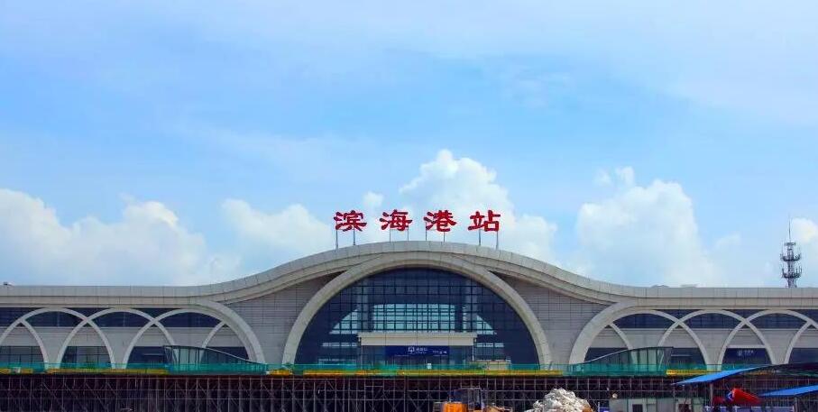濱海港站是國家“八縱八橫鐵路網”沿海鐵路中青鹽鐵路的一個中間站,位于江蘇省濱海縣東坎街道醫藥產業園附近,距縣城4.5公里,所處里程為青鹽線353km664m。青鹽鐵路濱海港站站房分為候車大廳、出站廳和售票廳,左右兩側為設備辦公用房,中部為單層候車大廳,建筑面積10061平方米,建筑總高度16.57米,站臺全長550米,總投資1.6億元。站房前是一個帶公園式的站前廣場,功能齊備,將充分滿足市民日常的出行。車站設計旅客日均發送量為2000人次,遠景規劃為10000人次,為中型鐵路客站。