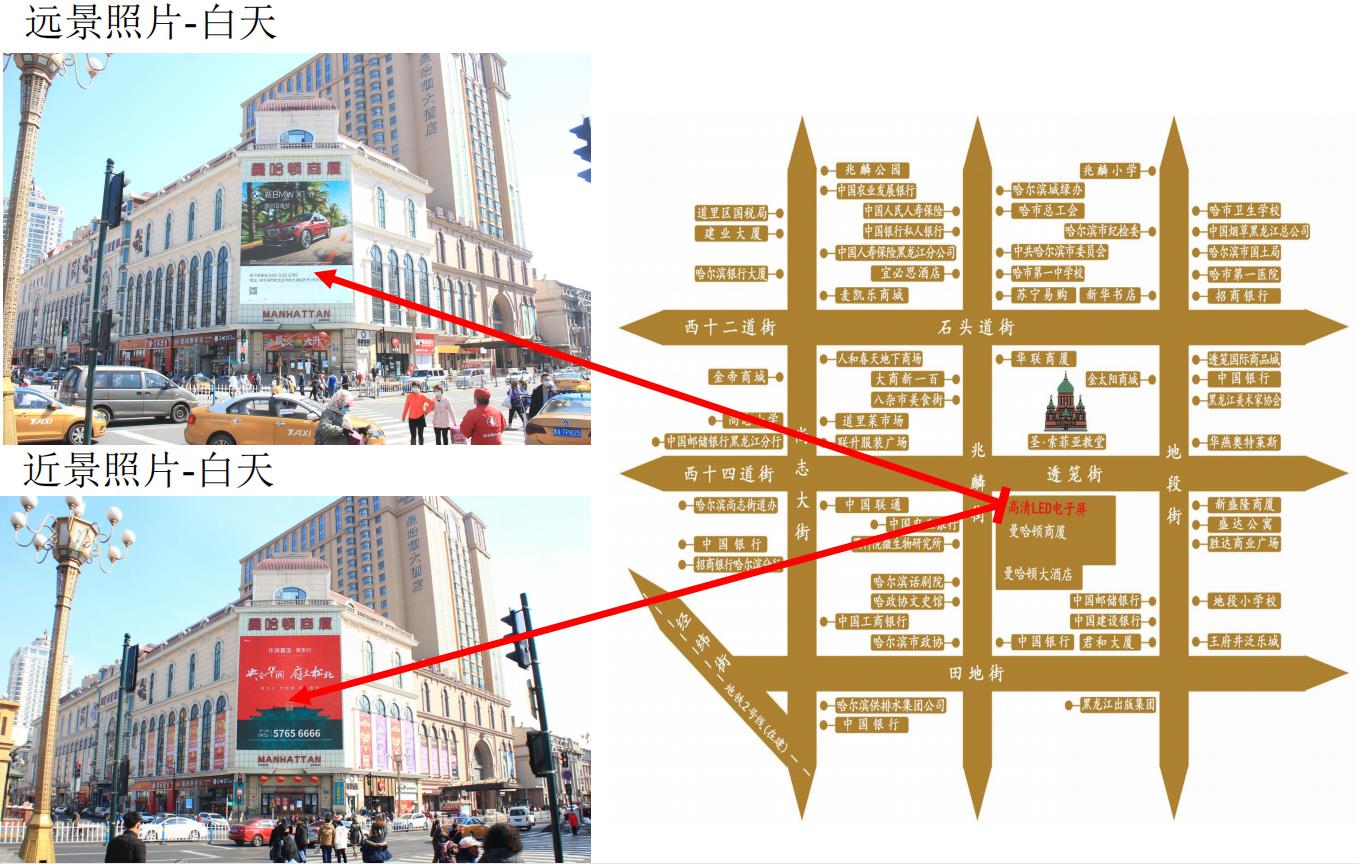 •此LED顯示屏位于道里區透籠街,與著名的圣·索非亞教堂隔道相望,鄰近哈爾濱市地標性建筑,薈萃冰城旅游業最具特色的景點,吸引國內外大批觀光旅游者,有強大的受眾群。