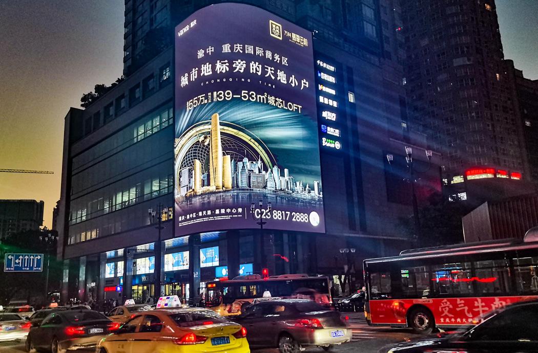 解放碑壹號屏坐落于解放碑CBD門戶,合景聚融廣場幕墻,左側為進出解放碑車流 量最大的十字進階——解放碑步行街。