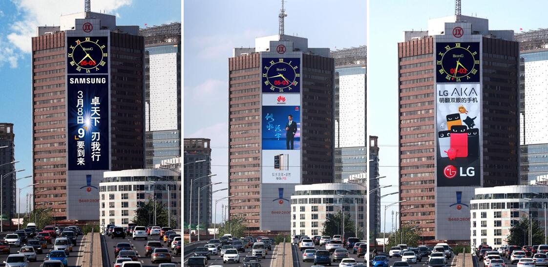 而如果從東三環去往首都機場,則更是必定長時間注意到該LED屏。對于來京、出京從事商務活動的人士來說,巨大的、占據了整個樓體的該LED屏,極佳的亮度和觀看視野,都注定會長時間留在人們的印象中,成為他們關于北京的城市記憶中重要的印跡。