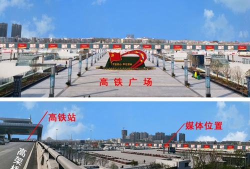 該媒體位于商丘站核心區(qū)高鐵站正對面。西有凱旋路,東有歸德路,媒體兩側(cè)緊靠車流量較多的高架橋出入口,正前方是人口密集的高鐵廣場,交通樞紐四通八達(dá),廣告位置明顯,視覺沖擊力強(qiáng)。無論是從高架橋上、高鐵廣場里或者高鐵站進(jìn)出站口處,都是最顯著的媒體。