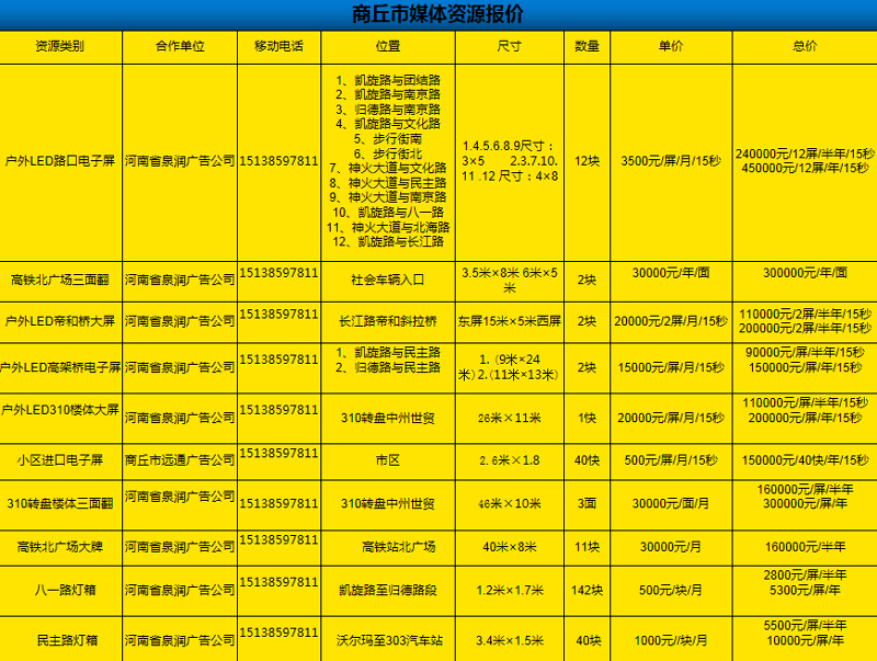 以上是商丘市所有的戶外媒體廣告,最后為您推薦全面的媒體廣告報(bào)價(jià):