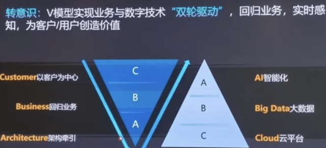 例如,華為在數(shù)字化轉型中意識到,數(shù)字化轉型是兩個詞,其中數(shù)字化是手段,轉型才是目的,轉型具體轉什么?是“五個轉變”:轉意識,轉模式,轉組織,轉文化,轉方法。以轉意識為例,大多數(shù)企業(yè)談數(shù)字化轉型講得做多的是“ABC”:人工智能、大數(shù)據(jù)、云平臺,而華為認為這些只是技術手段,首先要轉的是意識,即“CBA”:以客戶為中心,業(yè)務主導,架構牽引。