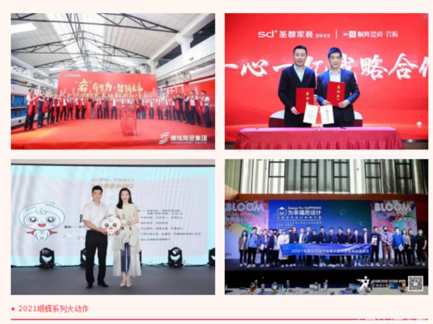 2021年,對于順輝人來說,是充實(shí)而忙碌的一年。3月,集團(tuán)第5條巖板智能生產(chǎn)線點(diǎn)火投產(chǎn),為全年巖板銷售提供強(qiáng)有力的保障;4月,順輝瓷磚·巖板攜手圣都家裝簽署“一心一億”戰(zhàn)略計(jì)劃,深耕整裝/家裝設(shè)計(jì)師渠道取得重要成果;5月,“516超級品牌日”啟動(dòng),李冰冰親臨助陣,引爆全網(wǎng)億+流量,品牌知名度與影響力得到進(jìn)一步提升;隨后,與廣州設(shè)計(jì)周合作發(fā)起的《為幸福而設(shè)計(jì)——中國住宅設(shè)計(jì)效果大賽》在全國80多個(gè)重點(diǎn)城市落地,通過舉辦系列城市沙龍與論壇游學(xué)活動(dòng),成功與全國五湖四海的設(shè)計(jì)師實(shí)現(xiàn)鏈接。一系列的大動(dòng)作讓順輝品牌在整裝/家裝設(shè)計(jì)師渠道實(shí)現(xiàn)流量轉(zhuǎn)化,助力業(yè)績倍增!