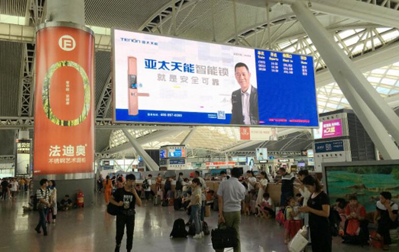 近年來,隨著高鐵成為商務人士出行最主要的渠道之一,高鐵廣告成為一線品牌宣傳的重要渠道。2017年,廣州南站累計發送旅客突破1億人,日均27萬人,累計到發旅客突破1.34億人,日均36萬人,旅客發送、到達人數位居全國各大車站前列。在人流量密集的廣州南站投放廣告,有利于讓亞太天能品牌與廣大消費者零距離接觸,獲得黃金曝光!