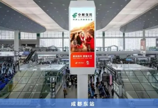 成都東站出發層候車大廳三面品牌柱,位于候車區西側商務候車區旁。燈箱為三面包柱,總面積達108㎡,360°無視覺盲區,100%覆蓋出發客流,視覺沖擊力很強。
