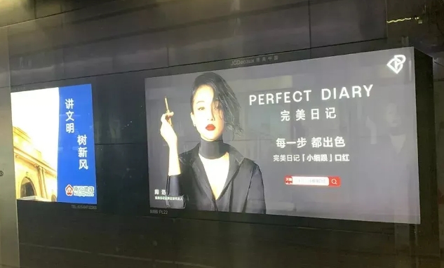 在去年10月,完美日記于北京、廣州、深圳、上海、杭州等全國100個(gè)核心城市投放60萬部電梯智慧屏,配合首支品牌廣告,官宣演員周迅為品牌全球代言人,為其全新的品牌形象宣傳造勢(shì)。